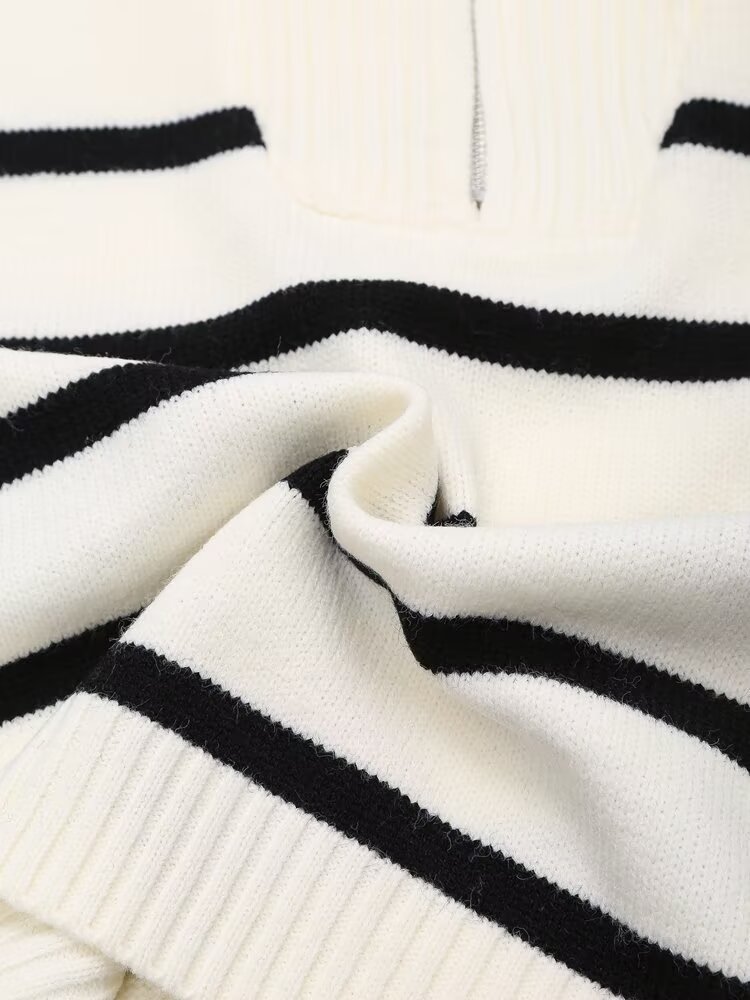This sweater combines a timeless striped pattern with a modern half-zip design, making it versatile for both casual and slightly dressier looks.